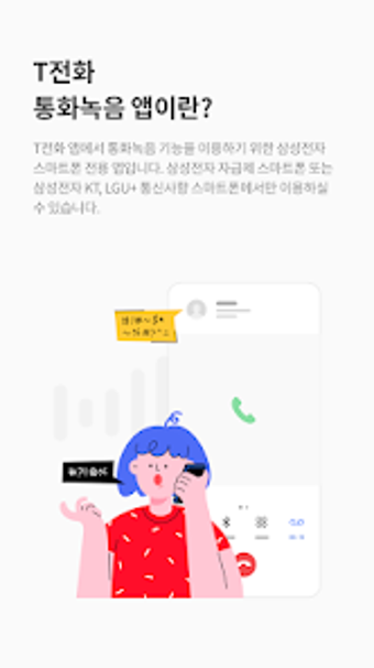 T전화 통화녹음을 사용할 때, 앱은 다음과 같은 접근 권한이 필요합니다: (1) 통화 녹음을 위한 마이크 (T전화 제외); (2) 녹음된 파일을 저장하기 위한 저장소; (3) T전화 앱에서 녹음 상태를 표시하기 위한 다른 앱 위에 표시하기.